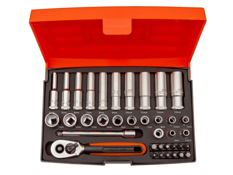 12 pcs 1/4″ hex sockets: 4, 4.5, 5, 5.5, 6, 7, 8, 9, 10, 11, 12, 13 mm|10 pcs 1/4″ hex deep sockets: 4, 5, 6, 7, 8, 9, 10, 11, 12, 13 mm|15 pcs 1/2″ hex sockets: 10, 12, 13, 14, 15, 16, 17, 18, 20, 21, 23, 24, 27, 32, 34 mm|9 pcs hex sockets AF: 3/8 7/16 (11) 1/2 9/16 11/16 3/4 (19) 13/16 7/8 (22) 1-3/16″|4 pcs 1/2″ hex impact sockets: 17, 19, 21, 24 mm|4 pcs 1/4″ socket drivers Phillips PH 1, 2, 3, 4|3 pcs 1/4″ socket drivers slotted 4, 5.5, 7 mm|6 pcs 1/4″ socket drivers hex 3, 4, 5, 6, 8 10 mm|3 pcs 1/4″socket drivers Pozidriv PZ 1, 2, 3|8 pcs 1/4″ socket drivers Torx T 8, 10, 15, 20, 25, 27, 30, 40|2 pcs 1/4″ extension bars 50 mm/2″ & 100 mm/4″|1 pc 1/4″ sliding T-bar 100 mm/4″|1 pc 1/4″ universal joint|1 pc 1/4″ spinner with 2-component handle|2 pcs 1/2″ extension bars 125 mm/5″ & 250 mm/10″|1 pc 1/2″ universal joint|1 pc 1/2″ spark plug socket hex 21 mm (13/16″)|1 pc 1/2″ T-adapter|3 pcs L-Keys hex 1.5, 2, 2.5 mm|1 pc 1/4″ ratchet, 60 teeth/6¡ action angle, quick release|1 pc 1/2″ ratchet, 60 teeth/6¡ action angle, quick release|4 pcs flex head spanners 8-9, 10-11, 12-13, 14-15 mm|13 pcs combination spanners 7, 8, 9, 10, 11, 12, 13, 14, 15, 16, 17, 18, 19 mm, on a practical removable tool-rack|1 pce removable three section plastic box with lid